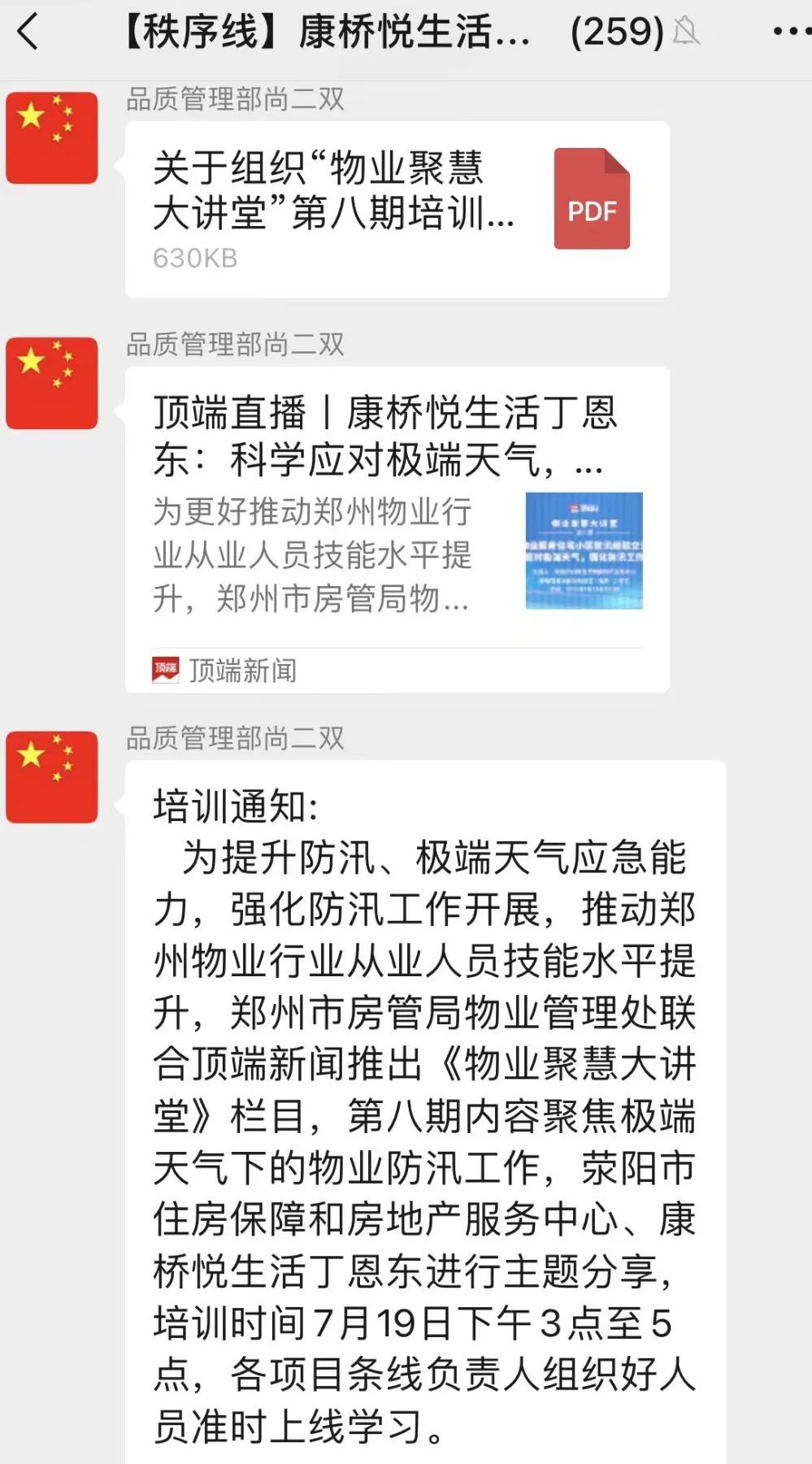 汛期以来,集团公司对防汛工作高度重视,多次下发各类防汛工作要求,并进行多次防汛培训及演练。公司智慧运营中心实时通过天眼及大数据关注各项目的汛情动向,及时通知相关人员跟进,最大限度做好预防工作。